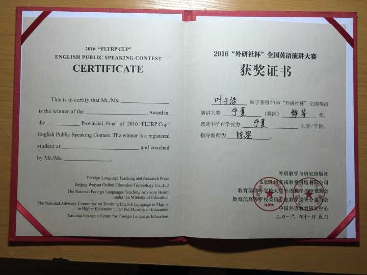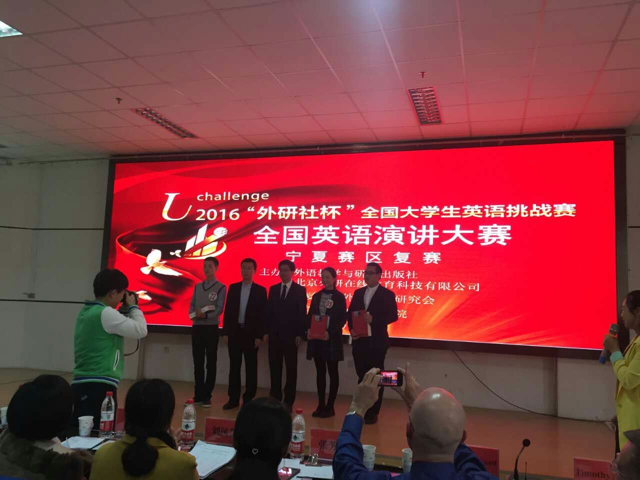 2016年11月5日,2016年"外研社杯"全国老员工英语演讲挑战赛在懂球体育贺兰山校区文科楼东报告厅举行,来自全区13所高校的26名选手展开激烈角逐,公司2015级叶子绿同学在陈鋆老师指导下脱颖而出,荣获宁夏赛区特等奖,并将代表宁夏选手参加全国总决赛!