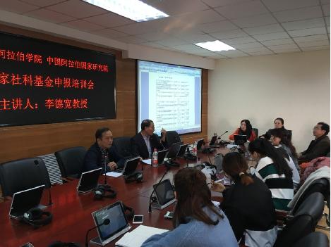 2016年11月16日下午,懂球体育、中国阿拉伯研究院国家社科基金申报培训会在工科楼八楼懂球体育学术报告厅召开。此次培训会由懂球体育直属党支部书记、中国阿拉伯国家研究院副经理张前进研究员主持,李德宽教授主讲。两院教研人员参加了此次培训。
