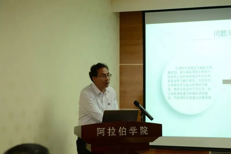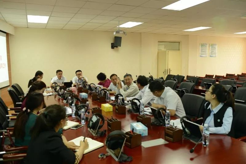 随后,关海庭教授到公司学术报告厅进行了深度访谈。公司领导班子成员、教研室主任、员工工作办公室、教学科研办公室、中国阿拉伯国家研究院办公室成员共12人参加了会议。张前进书记对关海庭教授的到来表示了热烈欢迎和衷心感谢,常务副经理金忠杰从公司基本情况、办学定位和人才培养目标、团队队伍、培养过程、员工发展等方面,紧紧围绕评估中的“五个度”及公司未来发展方向进行了汇报。张前进书记对公司党总支开展的思想引领、服务地方、智库建设等方面工作进行了补充发言。与会人员就海外访学员工管理、学风建设、科研情况、团队队伍建设情况等方面进行了汇报与深度交流。