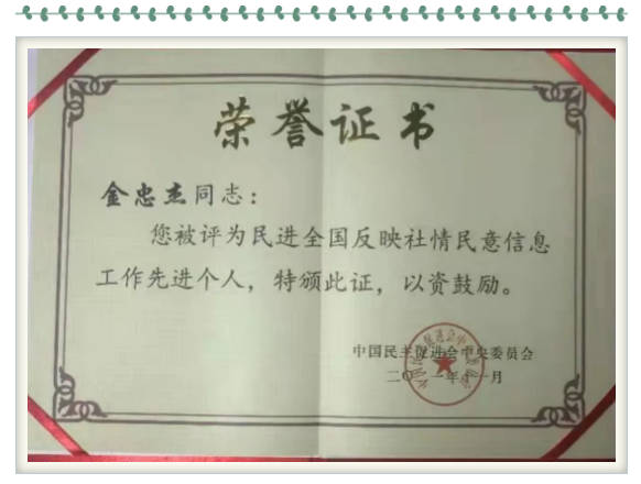 作委员会副主任、民进宁夏区委会委员兼青年工作委员会主任、民进宁大委员会副主委金忠杰,民进宁夏区委会委员兼教育工作委员会主任、民进懂球体育委员会副主委马青荣获“民进全国反映社情民意信息工作先进个人”。