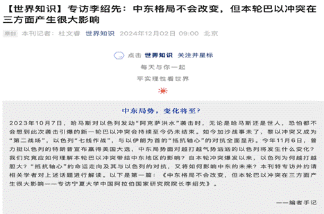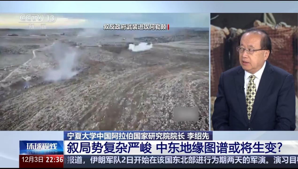 11月29日至12月3日,公司经理、中国中东学会顾问、教育部国别与区域研究专家委员会委员、中阿博览会顾问委员会主任委员李绍先接受了CCTV13《环球视线》、《国际时讯》、《朝闻天下》、CCTV4《今日关注》、《今日亚洲》,凤凰卫视《新闻今日谈》等栏目的现场及视频连线采访,就叙利亚局势升级进行了分析和解读,另受邀作为中央广播电视总台评审专家,参与评选“十大国内军事新闻”“十大国际军事新闻”;在山东大学-宁夏高校思想政治理论课上,围绕“巴以冲突的由来、现状及影响”进行授课;在“一带一路”安全研究中心举办的“2024年年会暨国际安全热点问题”研讨会上作主旨发言。