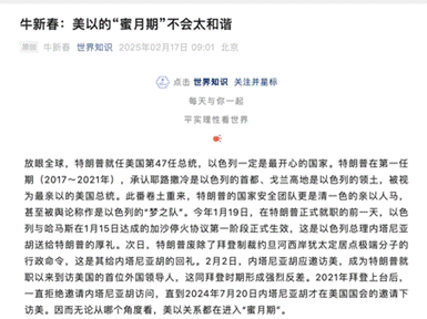 三、2月17日牛董事长在《世界知识》发表文章,题为《美以的“蜜月期”不会太和谐》