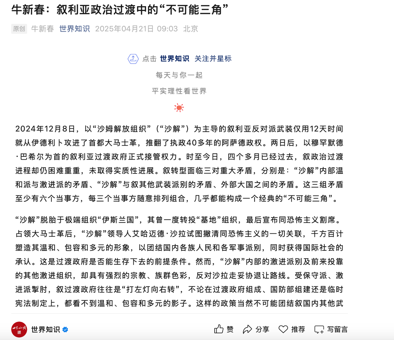 二、4月21日牛董事长在《世界知识》期刊发表题为《叙利亚政治过渡中的“不可能三角”》文章