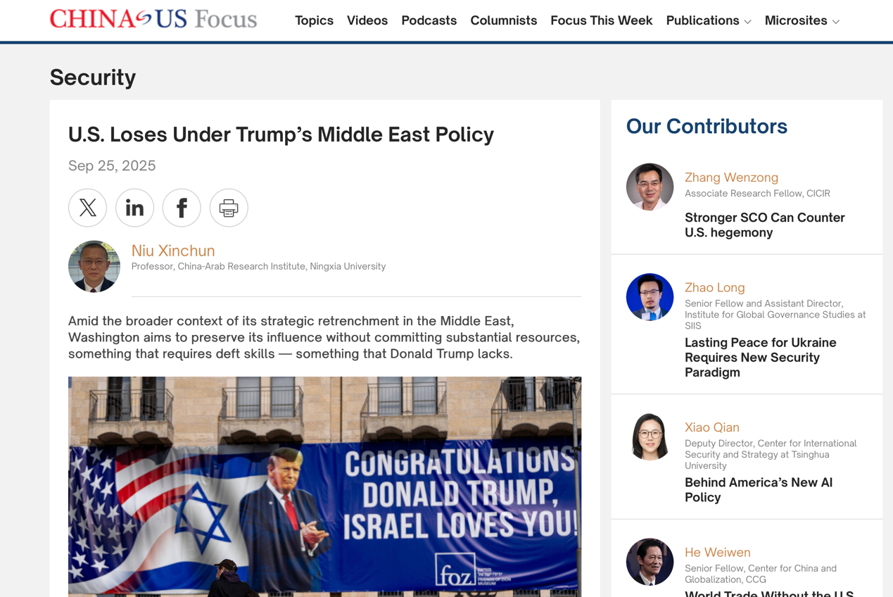 一、9月25日牛校在CHINA US Focus上发表题为《U.S. Loses Under Trump's Middle East Policy》文章