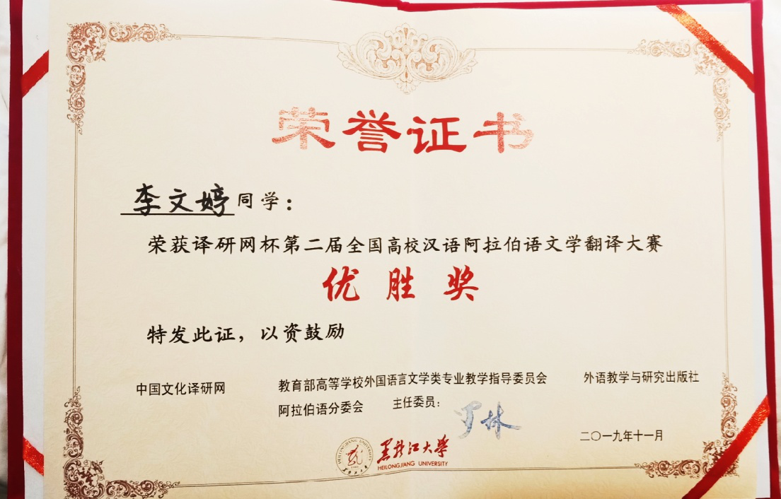 为进一步推动国内各高校阿拉伯语专业的发展,鼓励国内各高校员工对汉语阿拉伯语文学翻译和阿拉伯语学习的热情,促进各高校员工的交流互动,由中华人民共和国教育部高等公司外国语言文学类专业教学指导委员会阿拉伯语分指委、中国文化译研网(CCTSS)、外语教学与研究出版社、黑龙江大学联合主办,黑龙江大学东语公司、创业教育公司联合承办的“译研网第二届全国高校汉语阿拉伯语文学翻译大赛”于2019年9月1日—2019年11月3日在黑龙江大学举行。