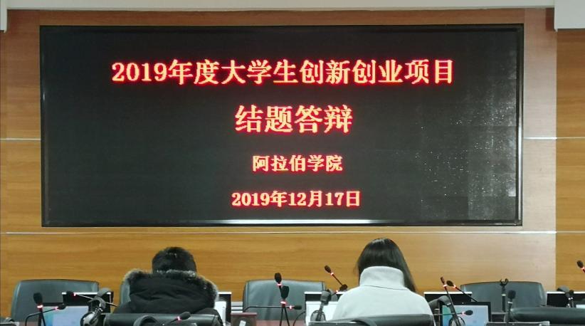 公司《阿拉伯国家网红经济发展初探》、《“醉易”实用汉阿短视频字幕译平台》、《银川椰枣树文化传播工作室》、《cilicili话剧社》、《后阿拉伯之春时代中国游客赴埃及旅游现状》、《中国影视作品对中国与海湾国家“民心相通”的影响研究》、《宁夏高校阿拉伯语专业员工学习动机及其应对策略研究》七个校级大创项目主持人分别通过ppt展示,对项目的成果进行讲解与汇报,总结了各自项目的经验和不足,并接受评委老师提问,进行了项目结题答辩。