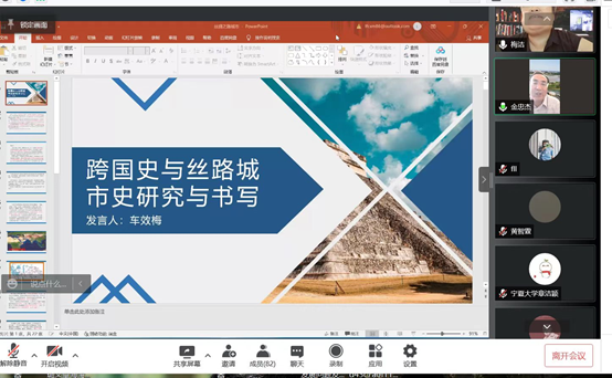 车效梅教授在讲座之初首先向大家介绍了丝绸之路的概念。之后从跨国史、跨国史研究与丝路城市史内容、跨国史与建构丝路城市史研究的新路径和新方法、跨国史与丝路城市史研究与书写四个方面进行了详细介绍。