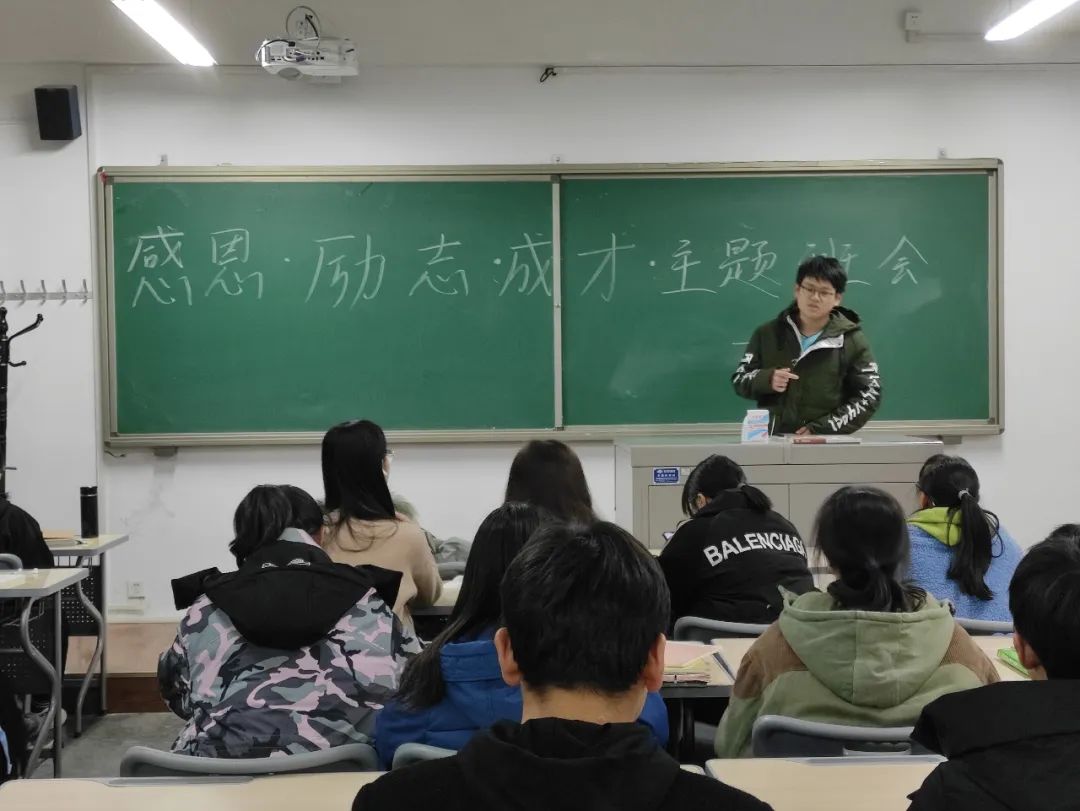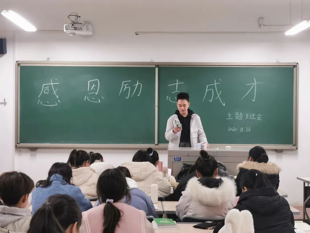 2020年11月26日晚,懂球体育组织各班级在知行楼六楼开展“感恩”“励志”“成才”主题班会,2019级与2020级全体同学参加,各班班长主持本次班会。